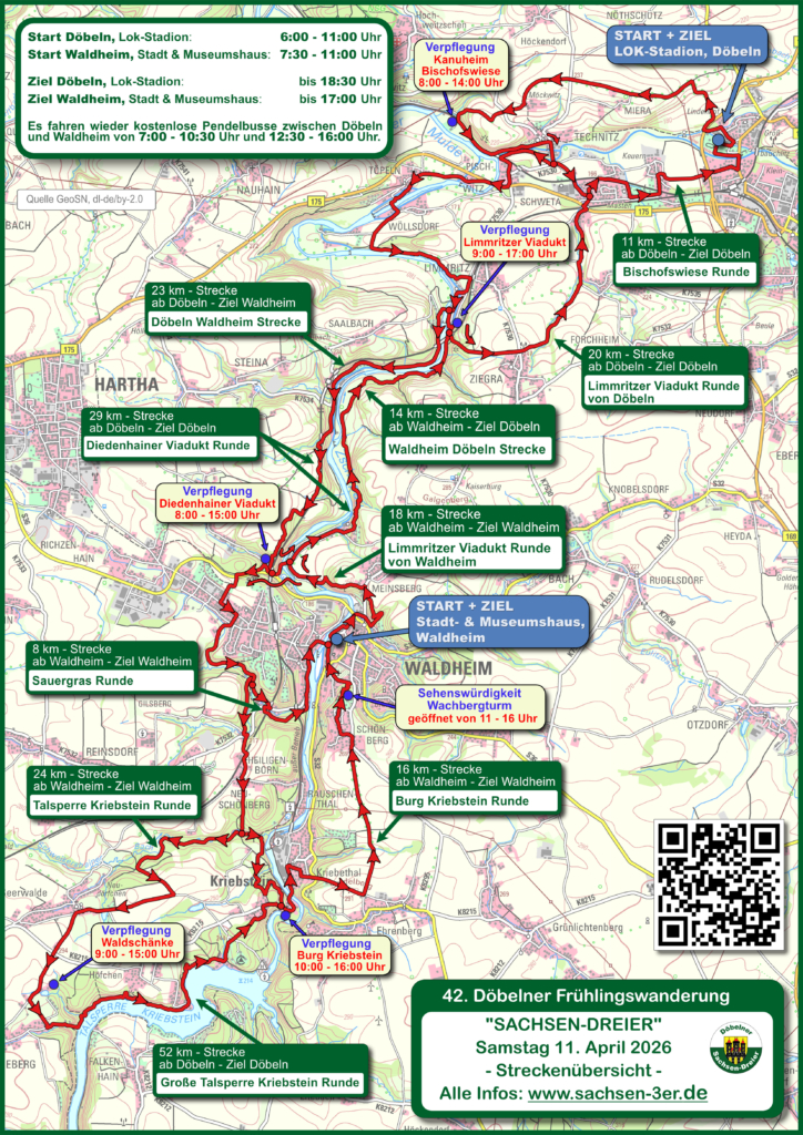 Entscheidet euch für Döbeln oder Waldheim als Start- und Zielort und überlegt, ob die Nutzung der kostenlosen Pendelbusse für euch in Frage kommt.